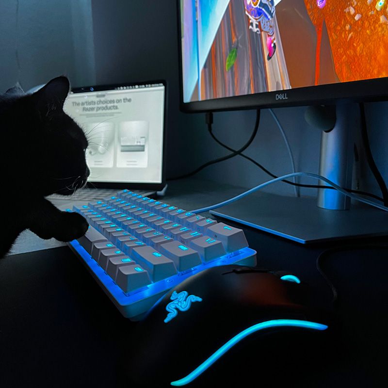"Meow, this Razer mouse is a sleek and stylish addition to any human's computer setup. Its smooth exterior and responsive buttons make it a joy to play with."